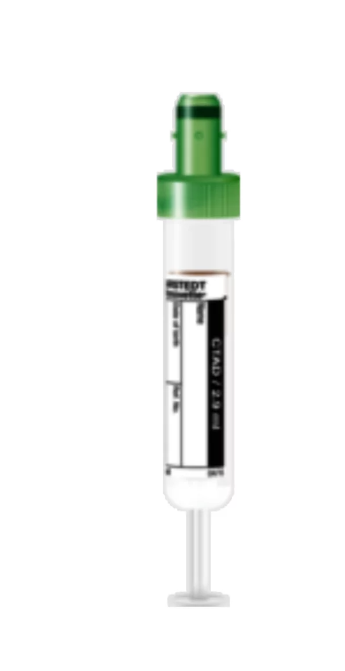 S-Monovette® CTAD są probówko-strzykawkami przeznaczonymi do diagnostyki krwi obwodowej. Służą do pobierania krwi pełnej i osocza. Próbkę pobraną S-Monovette® CTAD wykorzystuje się jako materiał badawczy w celu oznaczenia czynnika płytkowego 4 (PF4), β-tromboglobuliny (BTG) i inhibitora aktywatora plazminogenu (PAI-1), a także w rutynowych badaniach hemostazy. Probówka S-Monovette® CTAD zawiera antykoagulant cytrynian trisodu, teofilinę, adenozynę i dipirydamol w postaci roztworu. Proporcja mieszaniny CTAD do krwi wynosi 1:9 – 1 część objętościowa CTAD i 9 części objętościowych krwi.