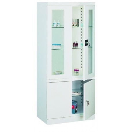 Korpus metalowej szafy lekarskiej wykonany z blachy gr. 0,8 mm. Drzwi szafy lekarskiej przeszklone, półki wykonane ze szkła bezpiecznego , przestawne co 25 mm. Uchwyt drzwiowy w metalowej szafie lekarskiej z zamkiem zabezpieczającym ryglującym drzwi w dwóch punktach. Dolna półka zabudowana - drzwi wykonane z blachy i zamykane na zamek kluczowy.