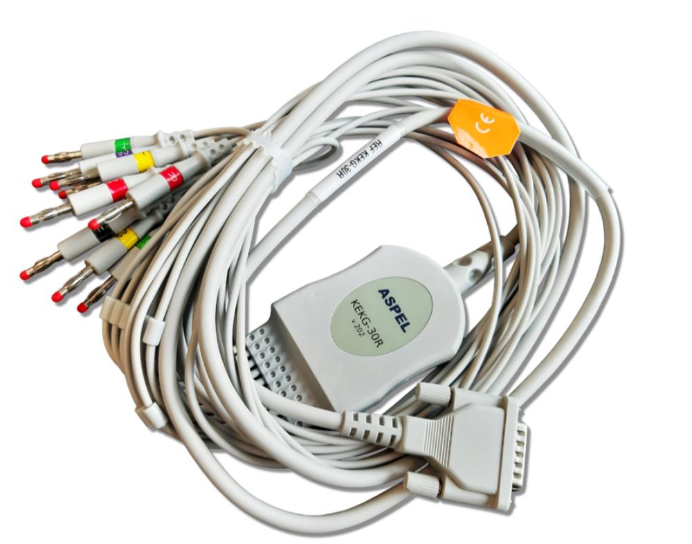 Kabel do aparatów EKG ASPEL KEKG-30R v.202 - przeznaczony jest do współpracy z elektrokardiografami ASPEL, które umożliwiają wykonywanie diagnostycznych badań EKG u dorosłych i pediatrycznych pacjentów we wszystkich placówkach służby zdrowia przez przeszkolony personel. Kabel ASPEL KEKG-30R ma za zadanie przekazywanie sygnałów elektrycznych obrazujących pracę serca z organizmu człowieka poprzez elektrody umieszczone na skórze pacjenta do elektrokardiografu. Kabel KEKG-30R umożliwia wykonanie bezpiecznych badań, w połączeniu z : łącznik do elektrod jednorazowych oraz elektrody jednorazowe.