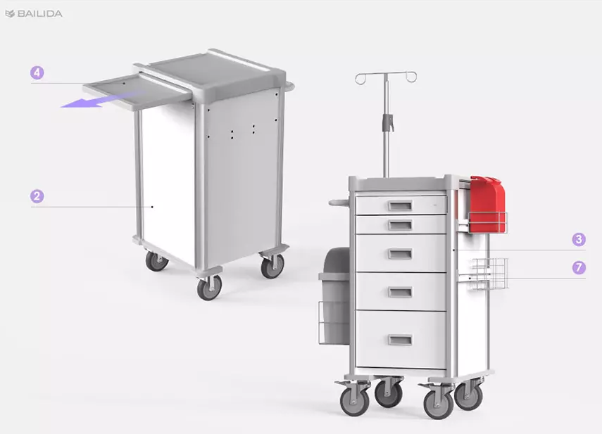 Wózek zabiegowy serii NC jest wyposażony w regulowany stojak na kroplówkę i aluminiowe zderzaki, które łączą w sobie elastyczne poręcze do mocowania akcesoriów do przechowywania akcesoriów, takich jak zestaw pojemników na ostre przedmioty, pojemnik na odpady i wielofunkcyjne miejsce do przechowywania w sytuacjach zapewnienia szybkiego leczenia ogólnych potrzeb pacjenta.
