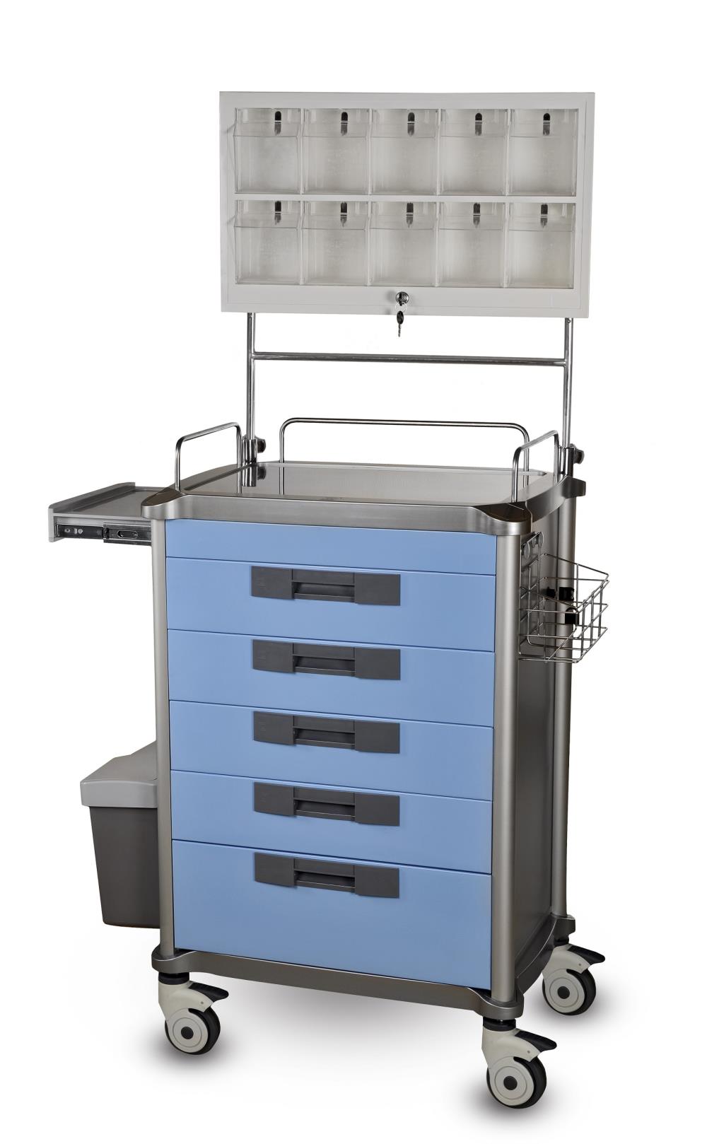 - solidna, stalowa nadstawna anestezjologiczna z 10 uchylnymi, przeźroczystymi pojemnikami na akcesoria,