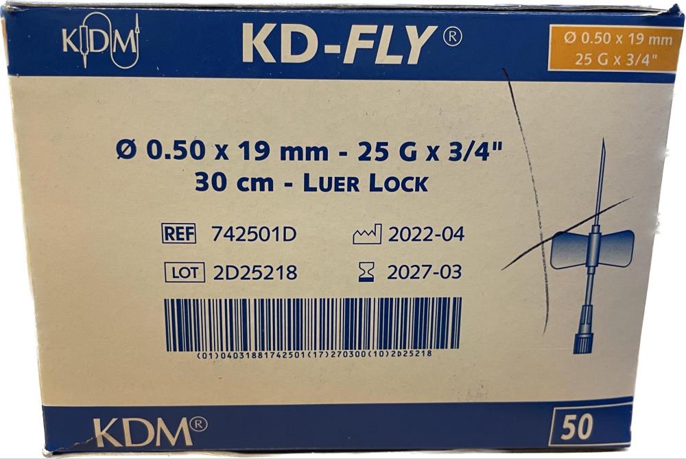 Igła motylkowa do pobierania krwi KD-FLY 25G, 0,50 x 19 mm, wężyk 30 cm luer lock.