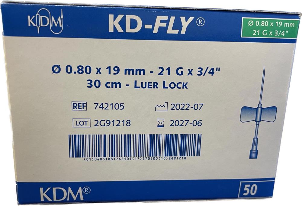 Igła motylkowa do pobierania krwi KD-FLY 21G, 0,80 x 19 mm, wężyk 30 cm luer lock.