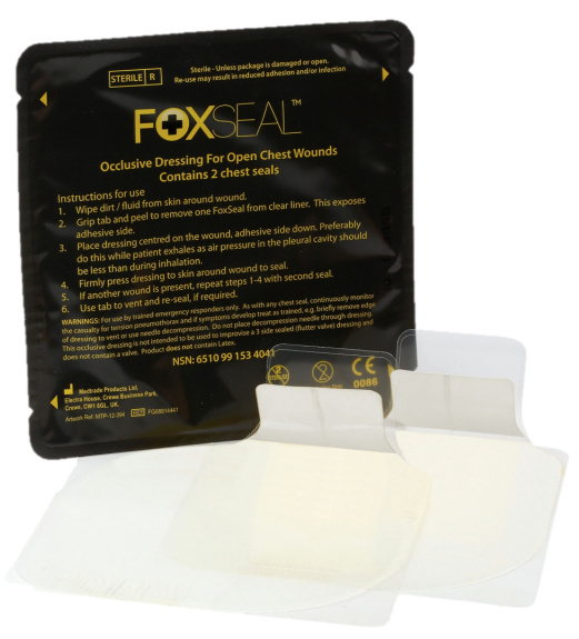 Foxseal Chest Seal (dwupak) - opatrunek okluzyjny do leczenia otwartych ran klatki piersiowej jako narzędzie zapobiegające odmie opłucnowej.