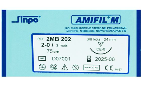 Sterylne nici chirurgiczne w postaci monofilu barwionego koloru niebieskiego, niewchłanialne i sterylizowane tlenkiem etylenu.