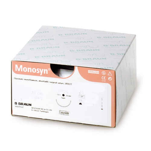 Monosyn® jest syntetycznym, monofilamentowym szwem o srednim okresie wchlaniania, wykonanym z glikonatu, dostepnym w kolorze bezbarwnym dla zamkniecia ran powierzchownych oraz fioletowym dla pozostalych wskazan. Monosyn® gwarantuje doskonale cechy uzytkowe i pewnosc wezla-  jest szczególnie rekomendowany do zespolen tkanek miekkich.