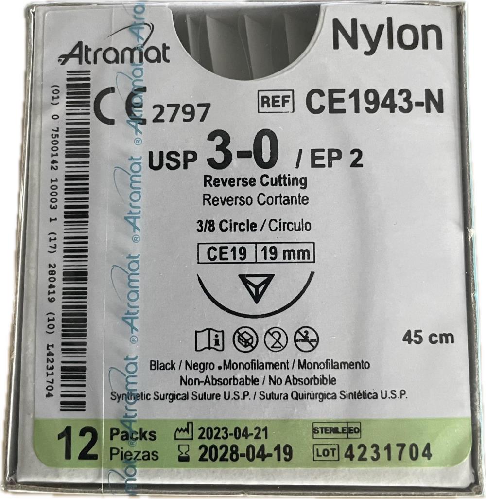 Nici nylonowe NYLON 3/0 dł. 45 cm 3/8 koła, igła odwrotnie tnąca, CE-19