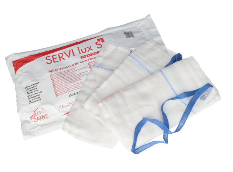 Serwety operacyjne wykonane z hydrofilowej gazy bawełnianej, bielonej metodą bezchlorową z użyciem wody utlenionej. Wyrób z nitką kontrastującą w promieniach RTG oraz z tasiemką pozwalającą na umocowanie poza polem operacyjnym. Materiał inwazyjny stosowany śródoperacyjnie do odsączania dużej ilości krwi i płynów ustrojowych z ran operacyjnych.