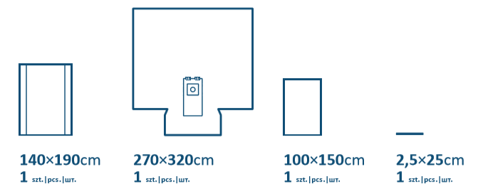- 1 serweta główna wzmocniona w kształcie "T" o minimalnych wymiarach 270 x 320 cm z samouszczelniającym się otworem i uchwytem na dreny i przewody typu rzep