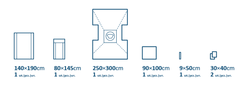 - 1 serweta główna o wymiarach 250 x 300 cm, ze zintegrowanymi nogawicami i przylepnym oknem z folią chirurgiczną otoczonym torbą do zbiórki płynów z 2 zaworkami spustowymi