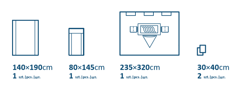 - obłożenia pacjenta dopasowane do odpowiednich procedur chirurgicznych, opcjonalnie wyposażone w dodatkowe elementy, tj. folie chirurgiczne, worki do zbiórki płynów, taśmy i rzepy oraz wysokochłonne wzmocnienia w strefie krytycznej,