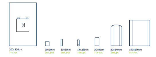- 1 x wzmocniona serweta 200 x 320 cm z otworem samouszczelniającym się o wymiarach 6cm x 8cm wykonana z hydrofobowej włókniny trójwarstwowej typu SMS oraz włókniny wysokochłonnej w obszarze wzmocnionym, zintegrowana z organizatorami przewodów