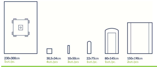 - 1 x wzmocniona serweta 230cm x 300cm z samouszczelniającym się otworem o średnicy 7cm, zintegrowana z 8 organizatorami przewodów, wykonana z chłonnego i nieprzemakalnego laminatu dwuwarstwowego oraz włókniny wysokochłonnej w obszarze wzmocnionym