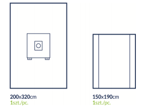 - 1 x wzmocniona serweta 200 cm x 320 cm z samouszczelniającym się otworem o średnicy 6cm x 8cm, wykonana z hydrofobowej włókniny trójwarstwowej typu SMS oraz włókniny wysokochłonnej w obszarze wzmocnionym, zintegrowana z organizatorami przewodów