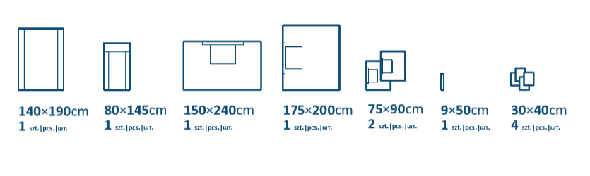 | Rozmiar cm | 140x190 | 80x145 | 150x240 | 200x240 | 30x40 | 9x50 | 30x40 |