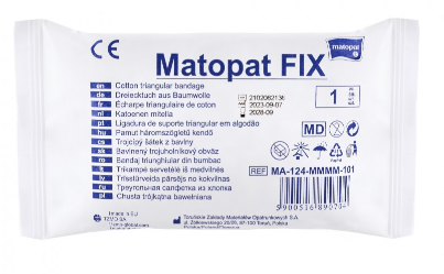 Chusta trójkątna Matopat FIX, powszechnie nazywana temblakiem, stosowana jest w czasie udzielania pierwszej pomocy do tymczasowego unieruchomienia kończyny w przypadku zwichnięć albo złamania: