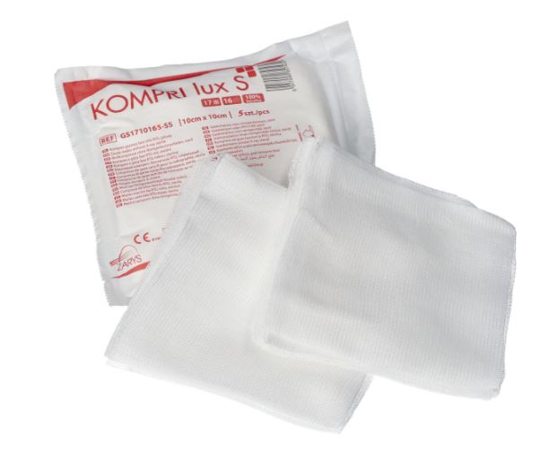 Kompresy KOMPRI lux S wykonane z hydrofilowej gazy bawełnianej bielonej metodą bezchlorową z użyciem wody utlenionej. Podwójnie podwijane brzegi (tzw. składanie typu „ES”) zapobiegają wysnuwaniu się luźnych nitek.