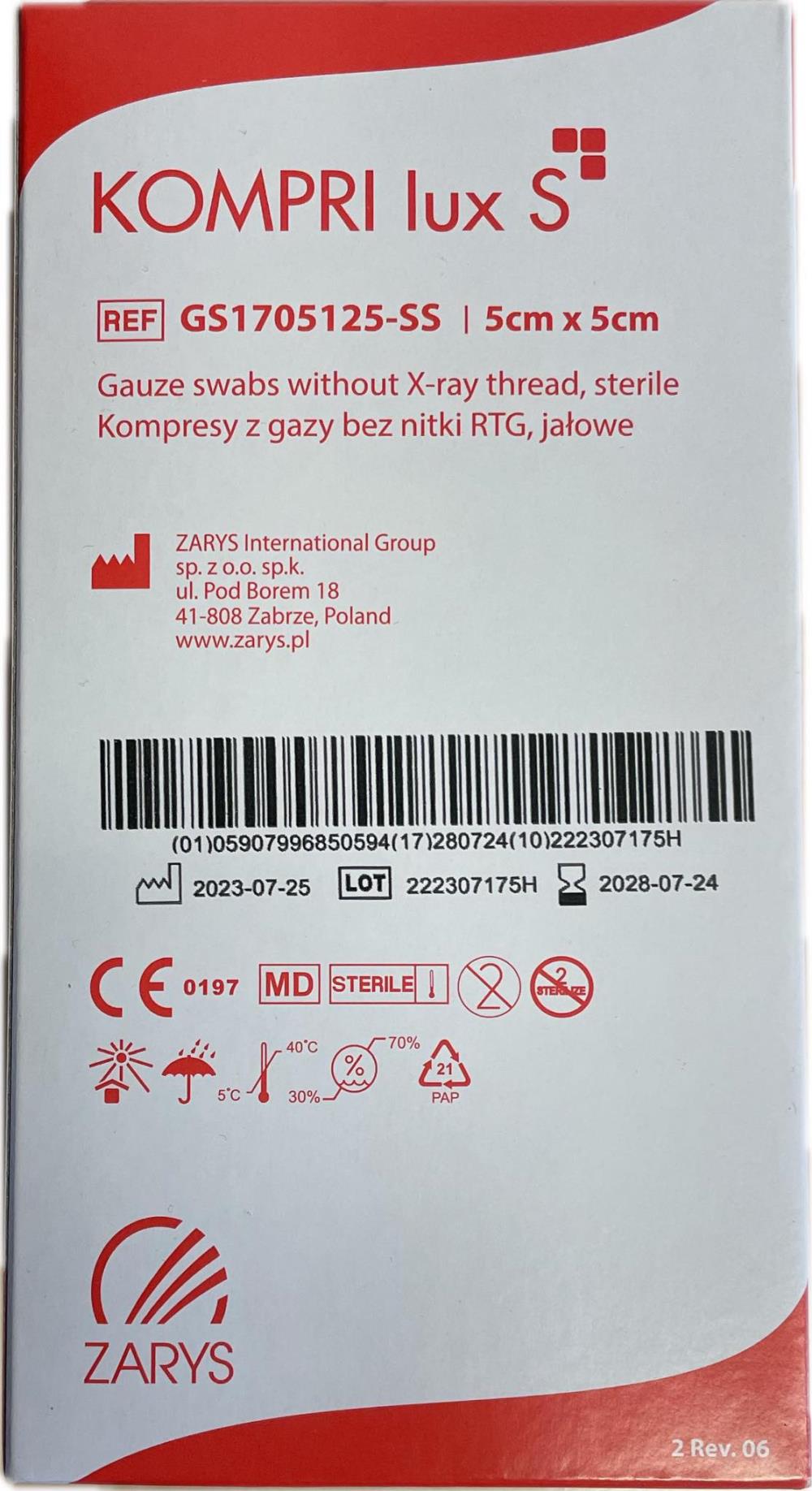 KOMPRI lux S to kompresy wykonane w 100% z miękkiej, doskonale chłonącej płyny bawełny. Bielone są za pomocą wody utlenionej, bez użycia chloru. Wszystkie brzegi kompresów są podwinięte, by zapobiec wysuwaniu się nitek. Grubość kompresów jest określona za pomocą liczby nitek i warstw - im wyższe wartości tym grubszy gazik.