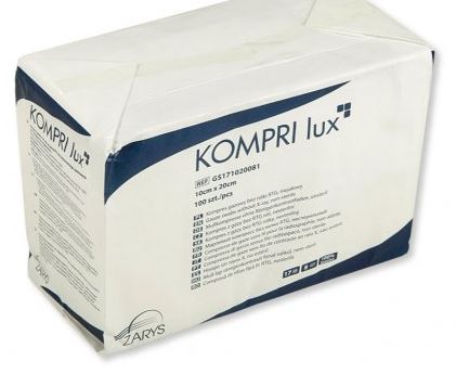 Kompresy KOMPRI lux wykonane z hydrofilowej gazy bawełnianej bielonej metodą bezchlorową z użyciem wody utlenionej. Podwójnie podwijane brzegi (tzw. składanie typu „ES”) zapobiegają wysnuwaniu się luźnych nitek. Wyrób medyczny po wyjałowieniu przeznaczony do ogólnego opatrywania ran w warunkach ambulatoryjnych, na blokach operacyjnych, oddziałach zabiegowych. Może być sterylizowany z zastosowaniem pary wodnej, tlenku etylenu lub radiacyjnie.