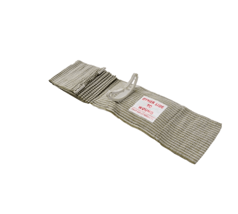 Opatrunek składa się z elastycznego bandaża w kolorze oliwkowym, do którego przytwierdzona jest plastikowa klamra. Jej zastosowanie daje wiele możliwości m. in. takich jak bezproblemowa zmiana kierunku bandażowania, czy też uzyskanie punktowego ucisku dokładnie w okolicach rany zwiększając efektywność tamowania krwawienia. Ponadto, klamra pozwala na szybkie zapięcie bandaża minimalizując szanse jego niekontrolowanego poluźnienia. Do opaski przymocowany jest także wysokochłonny kompres o wymiarze 10 x 18 cm, który skutecznie absorbuje krew i inne płyny organiczne. Na bandażu umieszczono przeszycia, które uniemożliwiają przypadkowe rozwinięcie.