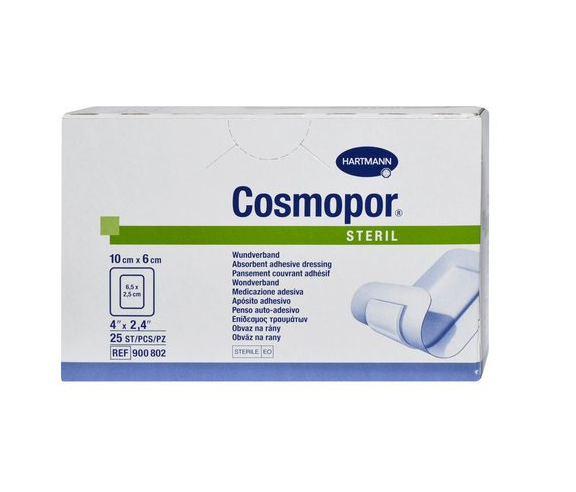 Opatrunek pooperacyjny jałowy Cosmopore E 20cm x 10 cm, op. 25 szt., to idealne plastry do zaopatrywania pooperacyjnych ran sączących, do jałowego opatrywania drobnych skaleczeń, np przy udzielaniu pierwszej pomocy. Plastry te są samoprzylepne. Zbudowane są z hydrofobowej mikrosiatki, która stanowi bezpieczną warstwę przylegającą do powierzchni rany i powoduje idealne wsiąkanie wydzieliny i transportowanie jej do warstwy chłonnej. Dzięki temu zjawisku sama siatka plastra pozostaje całkowicie sucha, co nie powoduje przyklejania się opatrunku do rany. Powoduje to bezbolesną zmianę opatrunku, który nie przykleja się bezpośrednio do rany. Warstwę chłonną tworzy 100% bawełniana wata, która dzięki specjalnemu ułożeniu ma znakomite zdolności absorpcyjne, a także spełnia funkcję wyściółki. Opatrunki są całkowicie przepuszczalne dla powietrza i pary wodnej, dzięki czemu skóra oddycha i nie są ograniczone jej naturalne funkcje. Plastry posiadają zaokrąglone rogi, co zapobiega przed niekomfortowym zwijaniem się opatrunku, nawet podczas długiego noszenia na ranie. Zewnętrzna warstwa opatrunku zawiera wodoodporną impregnację, co stanowi perfekcyjna ochronę przed infekcjami i zabrudzeniami rany. Plastry zawierają klej akrylowy, który jest bezpieczny dla skóry i nie powoduje podrażnień.