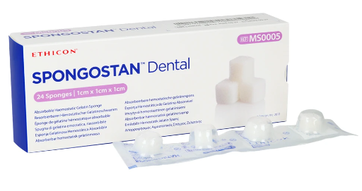 Spongostan, to jednorazowego użytku sterylna gąbka żelatynowa, o działaniu hemostatycznym. W stomatologii znajduje ona zastosowanie podczas ekstrakcji zęba oraz w przypadku niewielkich zabiegów chirurgicznych, którym towarzyszy krwawienie. Gąbka przylegając do krwawiącego miejsca, dzięki swej porowatości wychwytuje płytki krwi, dzięki czemu rozpoczyna się proces krzepnięcia. Spongostan przywiera do miejsca krwawienia i wchłania ilość płynu 45 razy przekraczającą jego ciężar. Gąbka zostaje całkowicie wchłonięta po 3-5 tygodniach od zastosowania.
