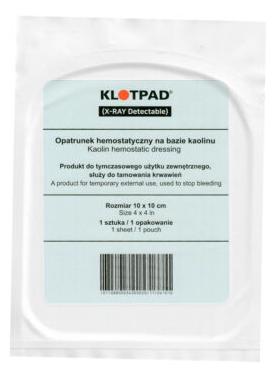 KLOTPAD 10 x 20 cm to opatrunek hemostatyczny w postaci kompresu nasączonego kaolinem – naturalnie występującym minerałem nieorganicznym, który wspomaga naturalny proces krzepnięcia krwi w organizmie, powodując szybki efekt hemostatyczny.