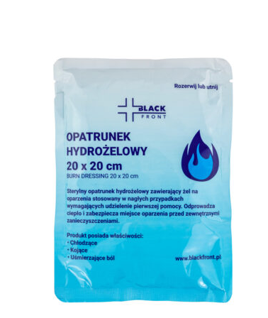 Opatrunek składa się ze sterylnego płata poliestru nasączonego specjalnym żelem chłodzącym, który absorbuje ciepło, chroni miejsce oparzenia przed zanieczyszczeniem i wnikaniem drobnoustrojów oraz znacząco łagodzi ból. Produkt posiada także właściwości antybakteryjne i przeciwgrzybicze. Żel chłodzący jest bezzapachowy, zgodny z pH ludzkiej skóry oraz hipoalergiczny – nie wykazuje reakcji alergicznych w kontakcie ze skórą. Opatrunek można bezpiecznie stosować u poszkodowanych ze wszystkich grup wiekowych, zarówno u niemowląt i małych dzieci, jak również osób starszych.