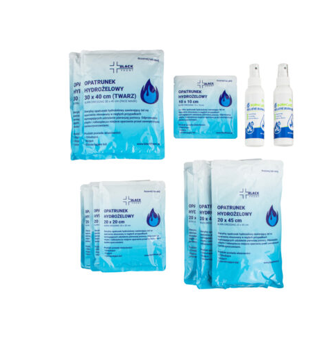 Zestaw zawiera 2 sztuki opatrunków hydrożelowych na twarz, 2 sztuki opatrunków w żelu o pojemności 120 ml oraz opatrunki hydrożelowe w formie kompresów o łącznej powierzchni 4000 cm2.