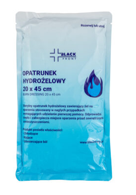 Opatrunek składa się ze sterylnego płata poliestru nasączonego specjalnym żelem chłodzącym, który absorbuje ciepło, chroni miejsce oparzenia przed zanieczyszczeniem i wnikaniem drobnoustrojów oraz znacząco łagodzi ból. Produkt posiada także właściwości antybakteryjne i przeciwgrzybicze. Żel chłodzący jest bezzapachowy, zgodny z pH ludzkiej skóry oraz hipoalergiczny – nie wykazuje reakcji alergicznych w kontakcie ze skórą. Opatrunek można bezpiecznie stosować u poszkodowanych ze wszystkich grup wiekowych, zarówno u niemowląt i małych dzieci, jak również osób starszych.