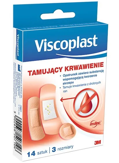 Viscoplast zestaw tamujący krwawienie to plastry z opatrunkiem, który zawiera specjalną substancję wspomagającą tworzenie skrzepu. Plastry są miękkie i łatwo dopasowują się do kształtu ciała. Przepuszczają powietrze i pozwalają skórze oddychać, co przyspiesza gojenie rany. Wykonane z hipoalergicznego, włókninowego materiału idealnie sprawdzają się w przypadku skóry wrażliwej i skłonnej do podrażnień. W opakowaniu znajdują się plastry o różnych kształtach i wymiarach, co umożliwia dostosowanie opatrunku do wielkości rany.