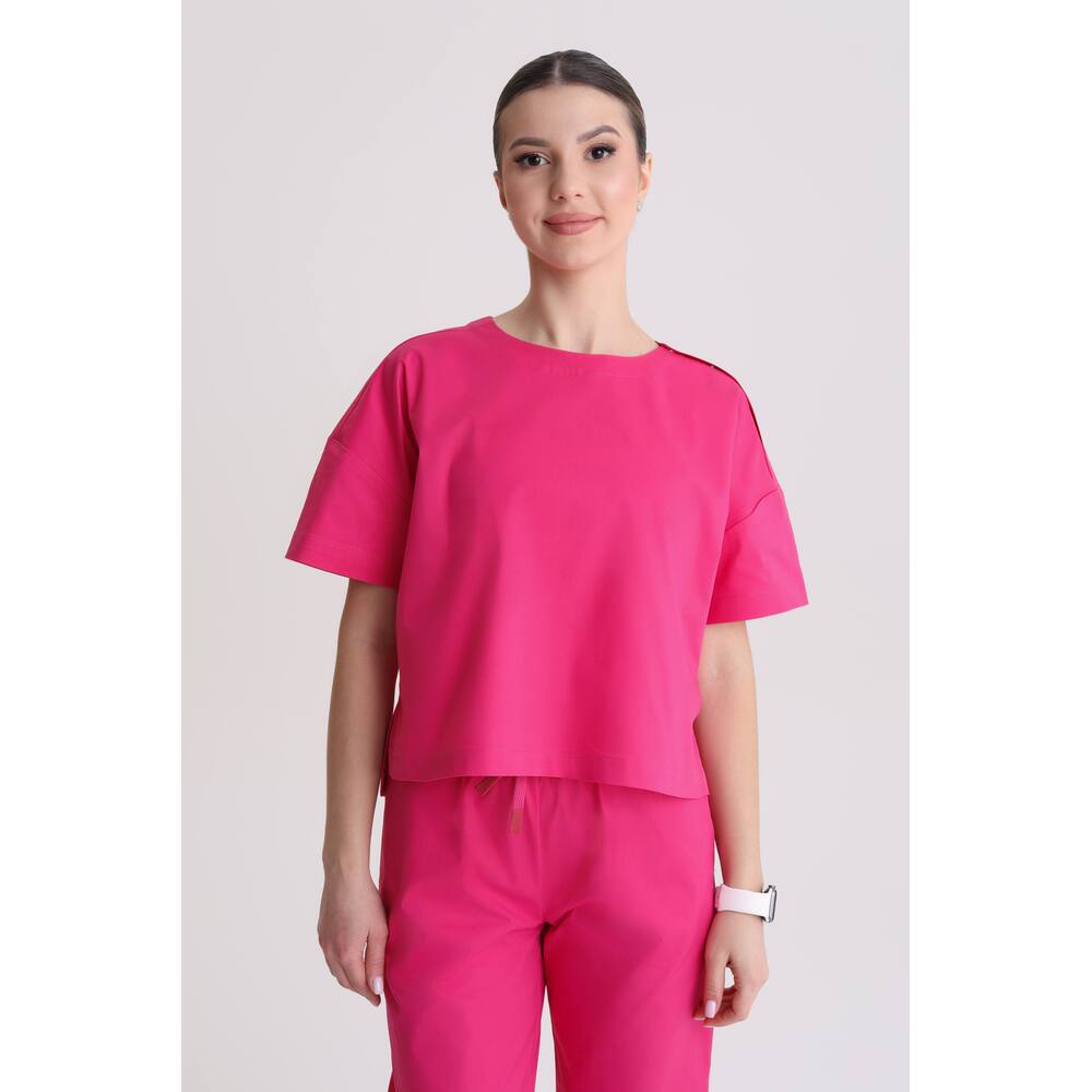 Nowoczesna bluza medyczna o luźnym kroju oversize, zaprojektowana z myślą o maksymalnym komforcie i swobodzie ruchów podczas pracy. Fason nie opina sylwetki, dzięki czemu świetnie sprawdzi się nawet podczas długich dyżurów. Model posiada klasyczny, płytki okrągły dekolt, krótkie rękawy oraz zaokrąglony wydłużony dół, który nadaje całości nowoczesny wygląd. Bluzka została wyposażona w praktyczne napy przy dekolcie, które ułatwiają zakładanie oraz zdejmowanie, a dodatkowo chronią materiał przed zabrudzeniem makijażem, np. podkładem. Starannie zaprojektowana linia ramion i pleców sprawia, że bluzka dobrze układa się na różnych typach sylwetek. Bluza uszyta jest z wysokiej jakości, oddychającej tkaniny: 98% bawełna, 2% elastan – materiał jest miękki, przyjemny w dotyku i lekko elastyczny, dzięki czemu doskonale dopasowuje się do ciała