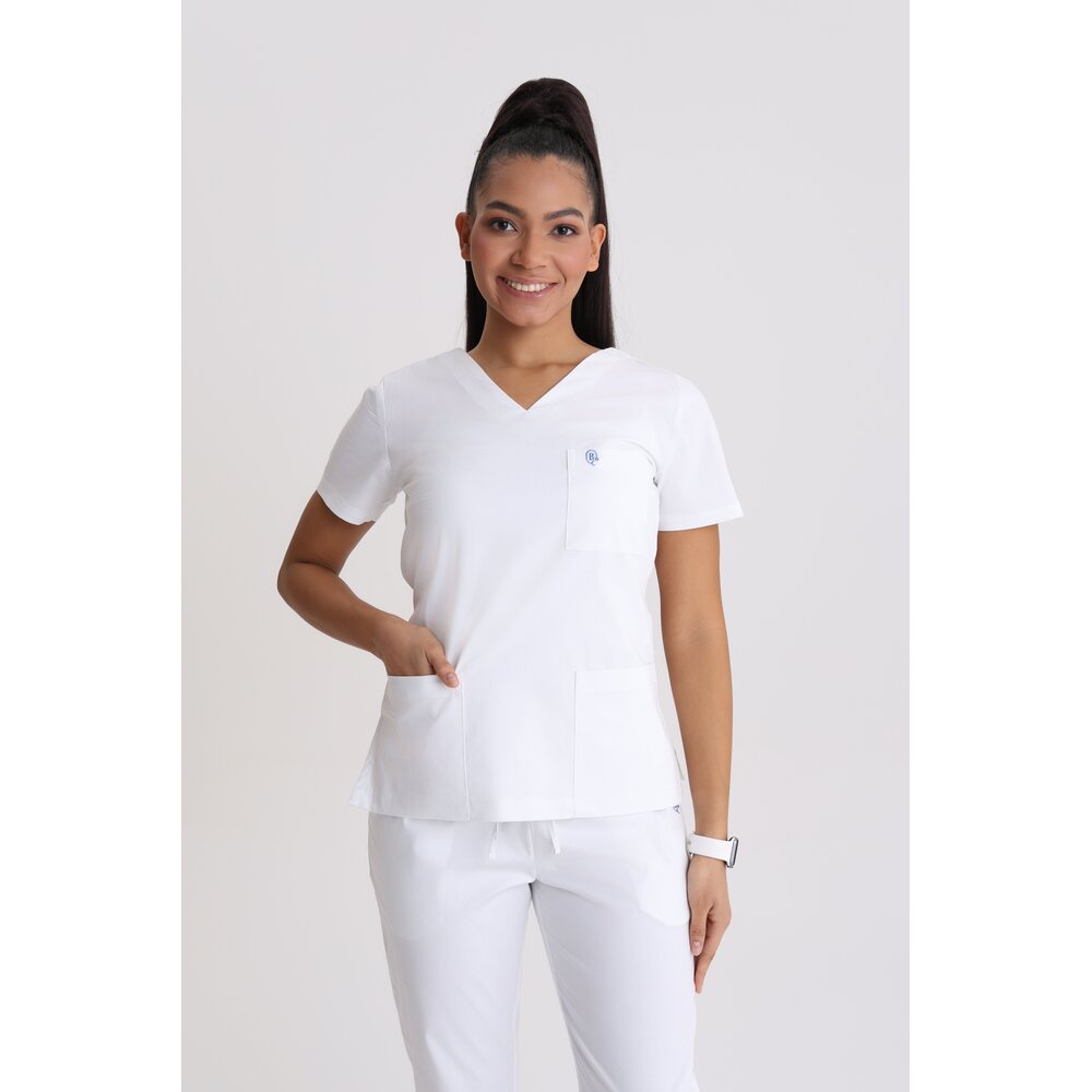 Nasza wiązana bluza medyczna typu classic fit to połączenie wygody i funkcjonalności w codziennej pracy. Posiada dekolt w kształcie litery V, który optycznie wysmukla sylwetkę, oraz krótkie rękawy zapewniające swobodę ruchu. Uszyta z wysokiej jakości tkaniny z przewagą bawełny (98% bawełna, 2% elastan). Dzięki praktycznym detalom – jednej kieszeni na piersi i dwóm obszernym kieszeniom dolnym – z łatwością zmieścisz wszystkie niezbędne akcesoria. Dodatkowe boczne troki pozwalają dopasować bluzę do figury, podkreślając talię i jednocześnie gwarantując komfort przez cały dzień. Minimalistyczny tył i estetyczne wykończenia sprawiają, że bluza prezentuje się schludnie i profesjonalnie. To uniwersalny model, który świetnie sprawdzi się w każdym środowisku medycznym.