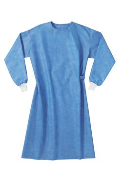 Fartuch pełnobarierowy z włókniny Spounlace (55 % pulpy celulozowej, 45% PES), fartuch z 3 trokami, rękawy zakończone bawełnianym 10 cm mankietem, rzep-zapięcie szyjne o długości 12 cm, pakowany w serwetę włókninową z 2 ręcznikami włókninowymi.