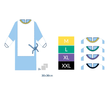 Fartuch pełnobarierowy z włókniny Spounlace (55 % pulpy celulozowej, 45% PES), fartuch z 3 trokami, rękawy zakończone bawełnianym 10 cm mankietem, rzep-zapięcie szyjne o długości 12 cm, pakowany w serwetę włókninową z 2 ręcznikami włókninowymi.