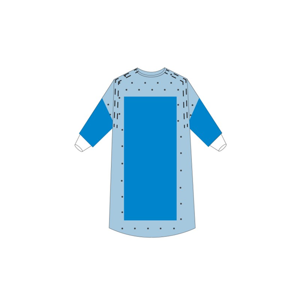 Fartuch pełnobarierowy z włókniny SMS ( 45g/m2), z wstawkami nieprzemakalnymi (PP + PE 28g/m2), szwy ultradźwiękowe w połączeniu z rękawem i na ramionach, pakowany w serwetę z 2 ręcznikami do rąk,