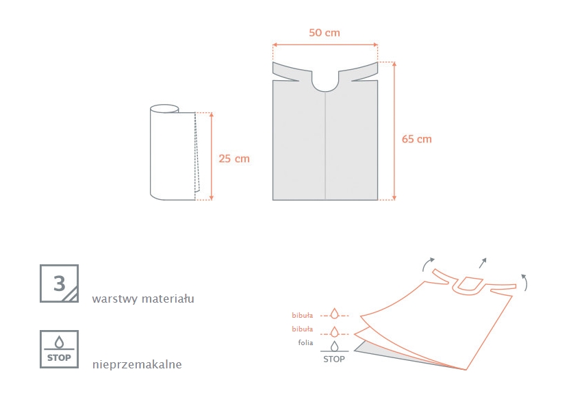 Nieprzemakalny śliniak ochronny bibułowo-foliowy. Śliniaki stomatologiczne Plus charakteryzuje duża powierzchnia oraz wchłanialność. Produkt ten jest bardzo przydatny podczas zabiegów, w których używa się dużej ilości płynów.