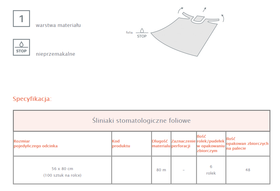 Nieprzemakalny śliniak ochronny foliowy. Śliniaki Normal wykonane są z folii PE. Śliniak chroni ubranie pacjenta podczas zabiegów stomatologicznych, badań i innych czynności wymagających zabezpieczenie odzieży przed zabrudzeniem czy zamoczeniem. Charakteryzuje je bardzo duża powierzchnia przykrywająca praktycznie cały tułów pacjenta.