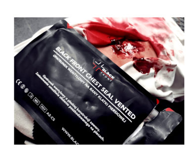 BLACK FRONT Chest Seal Vented to opatrunek wentylowy o płaskiej konstrukcji zaworu przeznaczony do opatrywania ran w obrębie klatki piersiowej. Jednokierunkowa konstrukcja zaworu umożliwia jednocześnie wypuszczanie powietrza zalegającego w klatce piersiowej, zmniejszając tym samym ryzyko wystąpienia odmy prężnej oraz blokuje dostęp powietrza z zewnątrz.