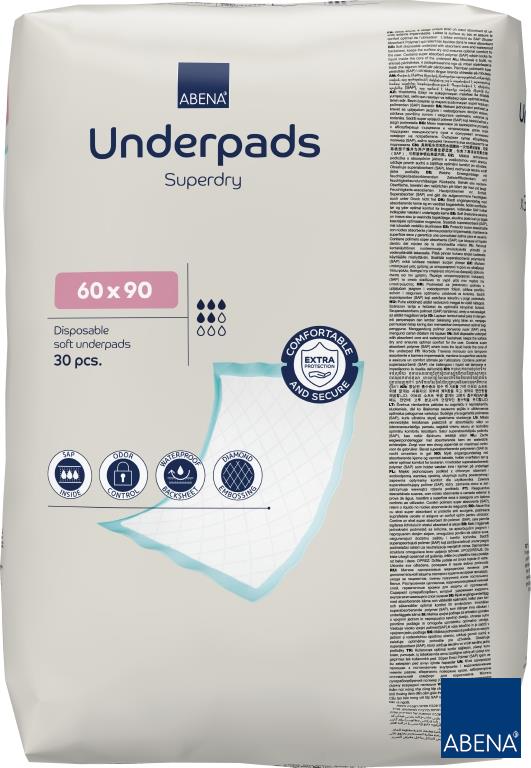 Podkłady Abena Underpads Superdry mają zastosowanie jako podkłady ochronne jednorazowe, np. łóżka i krzesła. Nadaje się dla osób nietrzymających moczu, ale także do zabiegów niesterylnych. Podkład zawiera zarówno puch, jak i SAP, który jeszcze szybciej kapsułkuje płyn, utrzymując powierzchnię suchą i zapewniając wygodę. System zapachowy minimalizuje nieprzyjemne zapachy. Dodatkowo podkładka posiada uszczelnione krawędzie zapewniające optymalną ochronę przed wyciekami, a powierzchnia pokryta jest miękką włókniną zapewniającą większy komfort użytkowania. Stosowanie tego jednorazowego podkładu zmniejsza ryzyko skażenia. Dostępna jest wersja z zakładkami bocznymi oraz wersja z taśmą. Wersje te idealnie nadają się dla aktywnych lub niespokojnych użytkowników, ponieważ podkładka jest nieruchoma.