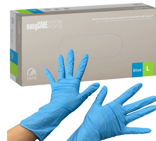 Rękawice easyCARE wykonane z nitrylu, z rolowanym mankietem, polimerowane na całej powierzchni. Z zewnątrz, mikrotekstura na całej dłoni z dodatkową teksturą na końcach palców. Wyrób jednorazowego użytku, zgodny z normami technicznymi, dopuszczony do kontaktu z żywnością, przeznaczony do diagnostyki pacjenta, zapewnia barierę dla transmisji mikroorganizmów pomiędzy operatorem a pacjentem, minimalizuje ryzyko zakażeń krzyżowych; zalecany podczas procedur o podwyższonym ryzyku zakażenia.