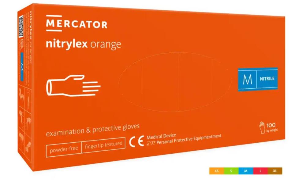 Wysokiej jakości medyczne, diagnostyczne i ochronne, niejałowe, bezpudrowe, jednorazowe rękawice nitrylowe w kolorze pomarańczowym.