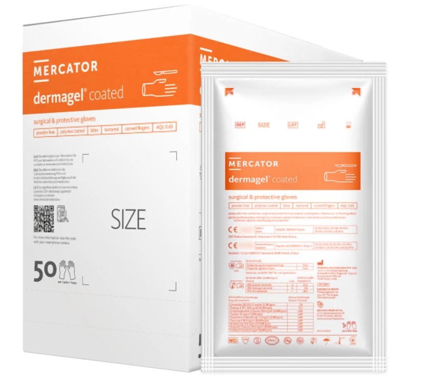 DERMAGEL COATED Rękawice chirurgiczne PF rozm. 7,5 z wewnętrzną bezlateksową warstwą polimerową, wykonane z wysokiej jakości lateksu kauczuku naturalnego, nie zawierają środka pudrującego. Mają lekko teksturowaną powierzchnię z wykończeniem mankietu w postaci równomiernie rolowanego brzegu, dzięki czemu rękawiczki nie zsuwają się z dłoni. Anatomiczny kształt zapewnia dopasowanie do powierzchni dłoni i komfort ich użytkowania a zróżnicowanie na prawą i lewą dłoń skutkuje idealnym dopasowaniem do dłoni, co zapewnia precyzyjne wykonywanie czynności podczas pracy.