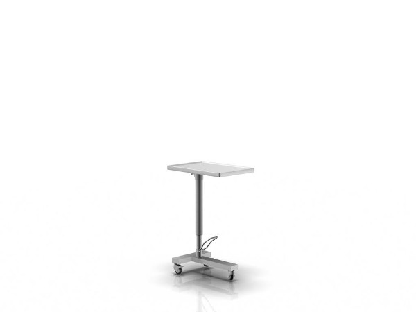 Stolik typu Mayo przeznaczony do gromadzenia instrumentów chirurgicznych z blatem podnoszonym przy pomocy pompy hydraulicznej, za pomocą dźwigni nożnej. Blat obracany w poziomie o 360 stopni. Podstawa w kształcie litery T z trzema pojedynczymi kółkami o średnicy 80mm. Wszystkie koła wyposażone są w blokadę, a oponki wykonane są z materialu, który nie brudzi podłoża.