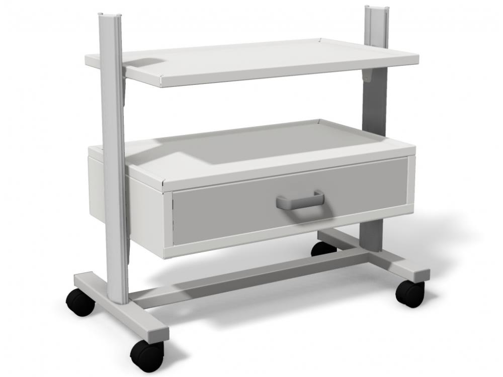 Stolik pod aparaturę medyczną znajduje zastosowanie w przewozie na niedalekie odległości narzędzi oraz aparatury medycznej w szpitalach oraz gabinetach zabiegowych. Stolik wykonany z aluminium i stali, pokrytej lakierem proszkowym. Osadzony jest na kółkach jezdnych z hamulcem. Tace stolika wykonane ze stali pokrytej lakierem proszkowym. Stolik posiada 2 półki oraz szufladę. Istnieje możliwość zamontowania listwy zasilającej oraz ustawienia zarówno półek jak i szuflady na dowolnej wysokości wzdłuż aluminiowego profilu.