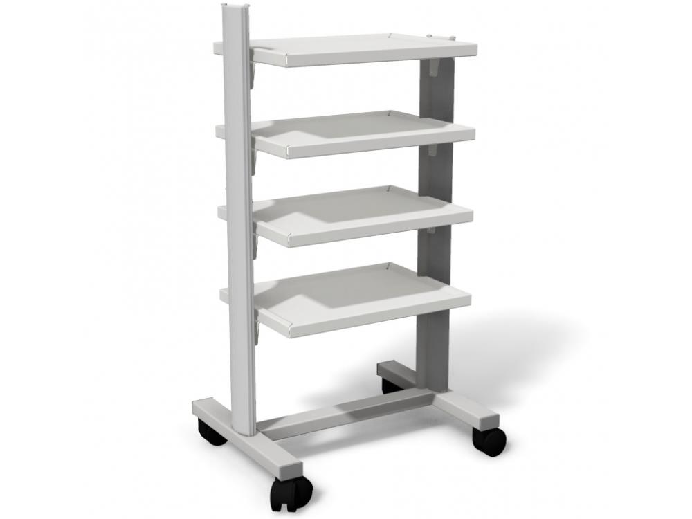 Stolik pod aparaturę medyczną znajduje zastosowanie w przewozie na niedalekie odległości narzędzi oraz aparatury medycznej w szpitalach oraz gabinetach zabiegowych. Stolik wykonany z aluminium i stali, pokrytej lakierem proszkowym. Osadzony jest na kółkach jezdnych z hamulcem. Tace stolika wykonane ze stali pokrytej lakierem proszkowym. Stolik posiada 4 półki. Istnieje możliwość zamontowania listwy zasilającej, wysięgnika kroplówki oraz wysięgnika kabli (opcja za dopłatą dla stolika z wysokim profilem bocznym). Wysięgnik kroplówki posiada 2 haki wieszaków. Istnieje możliwość ustawienia półek na dowolnej wysokości wzdłuż aluminiowego profilu.