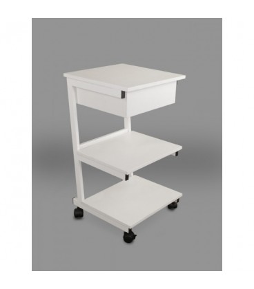 Stolik pod aparaturę medyczną znajduje zastosowanie w przewozie na niedalekie odległości narzędzi oraz aparatury medycznej w szpitalach oraz gabinetach zabiegowych. Metalowe stoliki pod aparaturę wykonane są z profili aluminiowych pokrytych farbą proszkową. Półki oraz szuflada wykonane są z białej płyty laminowanej. Kółka zamontowane w szafce umożliwiają łatwe przemieszczanie.
