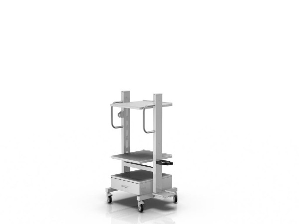 Wózek do aparatury z dwoma regulowanymi półkami oraz szufladą umieszczoną w dolnej części wózka. Szuflada wyposażona w prowadnice samodociągowe. Wózek wyposażony jest w dwa uchwyty do prowadzenia oraz listwę zasilającą na 6 gniazd. Wyrób zamieszczony na kółkach o średnicy 100mm (dwa z blokadą). Oponki wykonane z materiału który nie brudzi podłoża.
