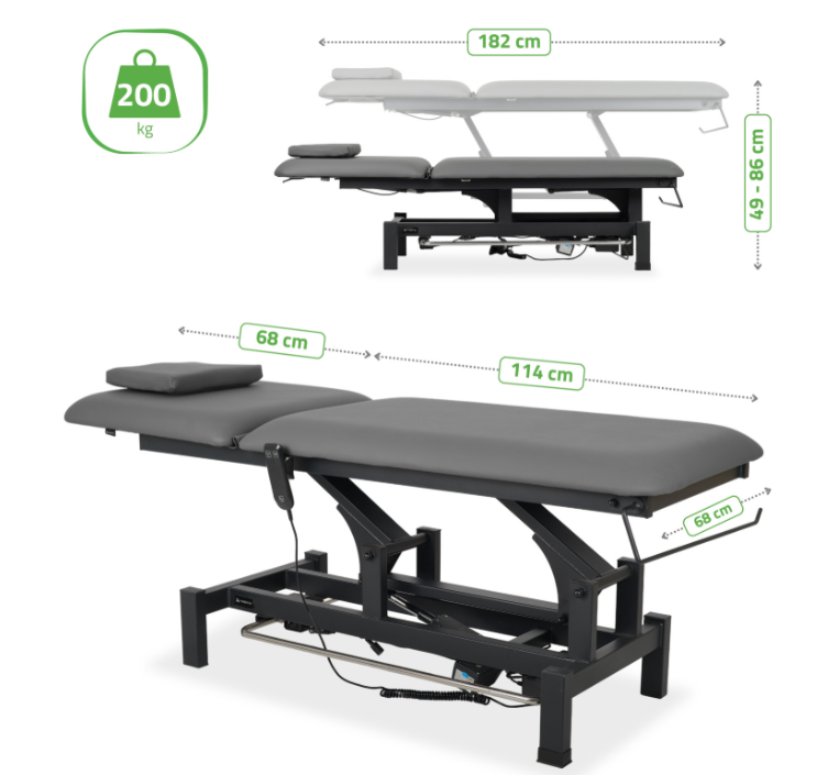Stół wyposażony w 2 segmentowy blat, otwór na twarz, pilot ręczny i ramę sterującą - do 200 kg.