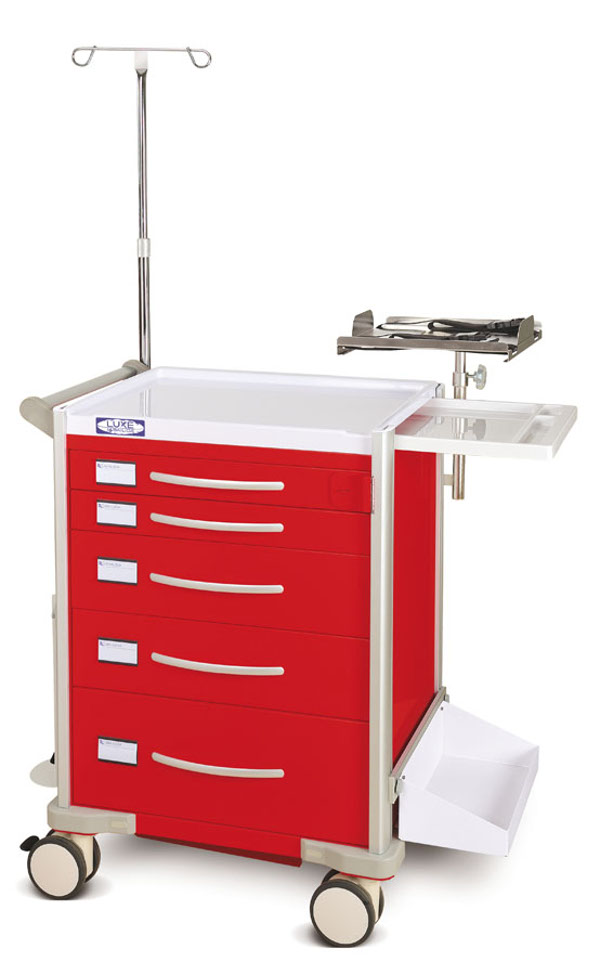 Wózki medyczne LX to luksusowa seria wózków medycznych wykonanych z najwyższej jakości materiałów z dbałością o każdy szczegół. Wózki reanimacyjne LX, oprócz standardowego wyposażenia, posiadają blaty z gładkiego tworzywa ABS, aluminiowe uchwyty oraz praktyczne odbojniki. Wózki LX posiadają funkcję samoczynnego domykania szuflad oraz magnetyczne identyfikatory. Nowe rozwiązania techniczne pozwalają na prosty i szybki montaż akcesoriów bez użycia narzędzi. Wózki wyposażone są standardowo w koła przeciwpyłowe.
